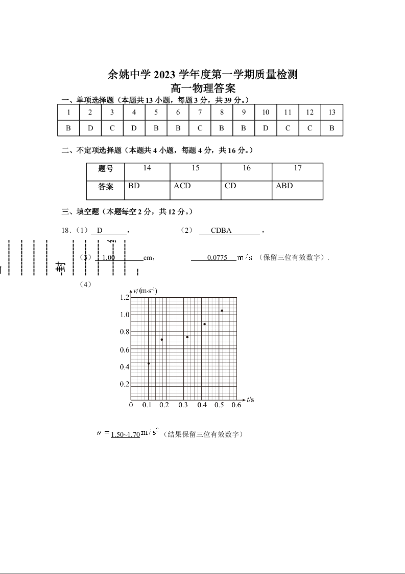 浙江省余姚中学2023-2024学年高一上学期第一次质量检测物理答案