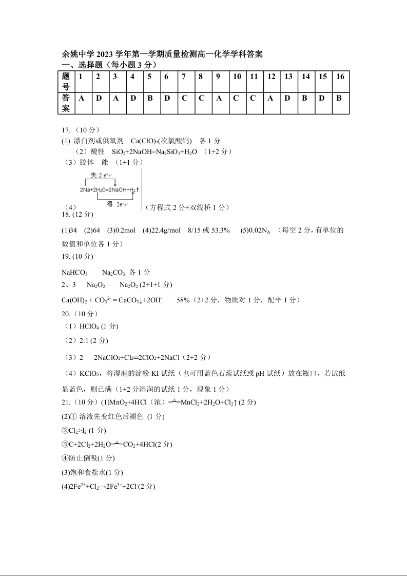 浙江省余姚中学2023-2024学年高一上学期第一次质量检测化学答案