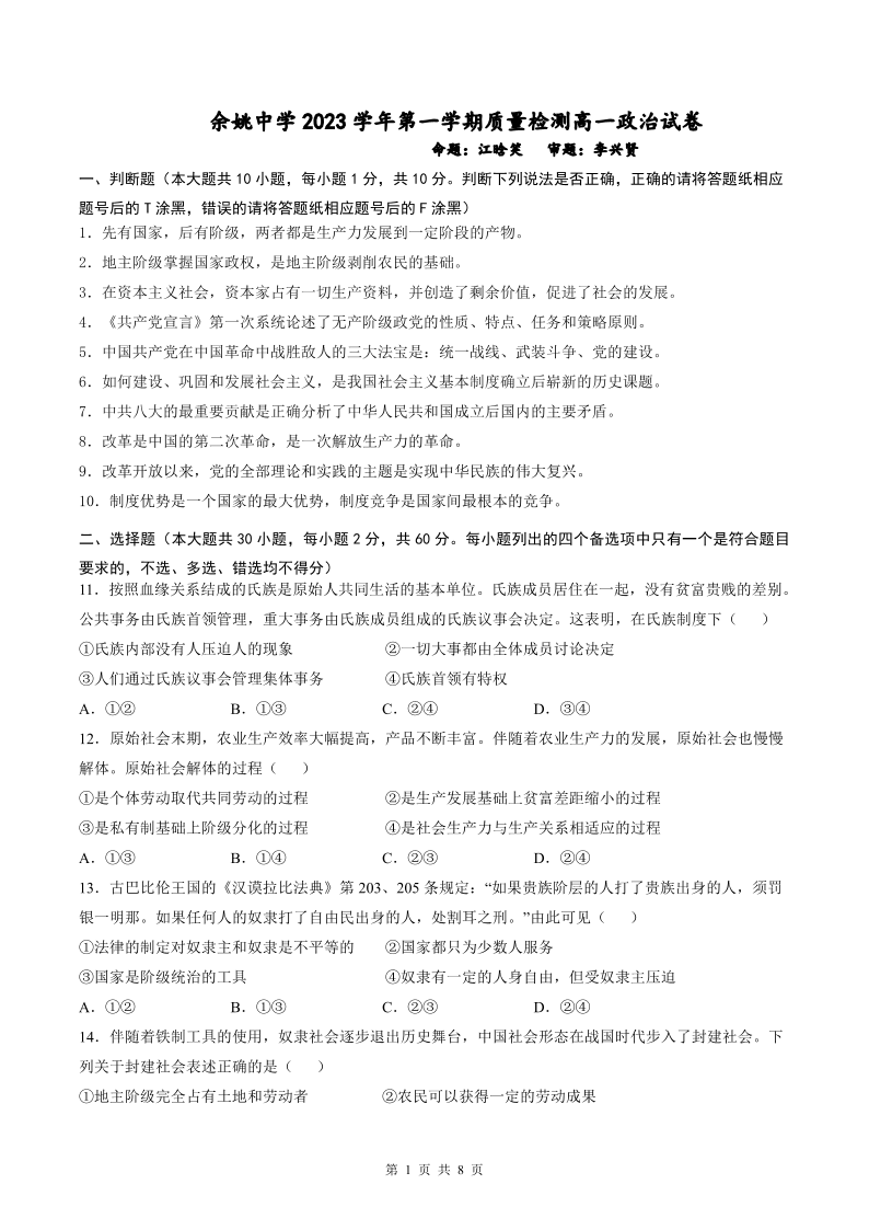 浙江省余姚中学2023-2024学年高一上学期第一次质量检测政治