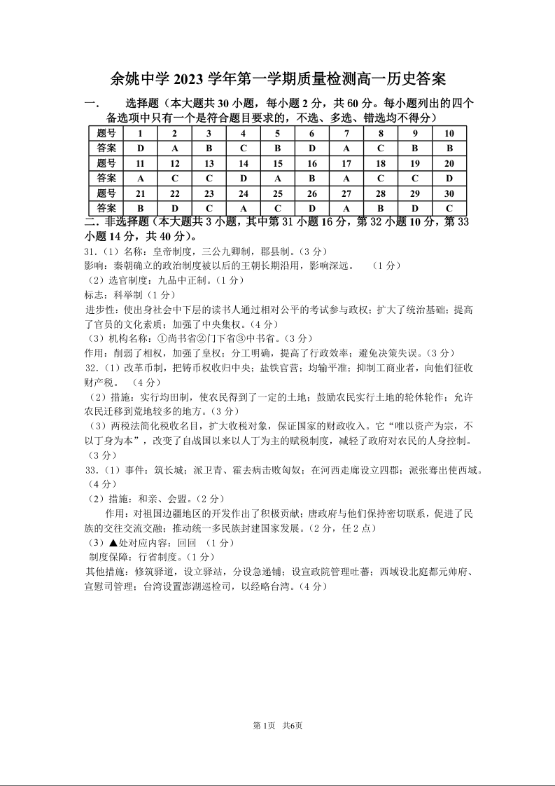 浙江省余姚中学2023-2024学年高一上学期第一次质量检测历史答案