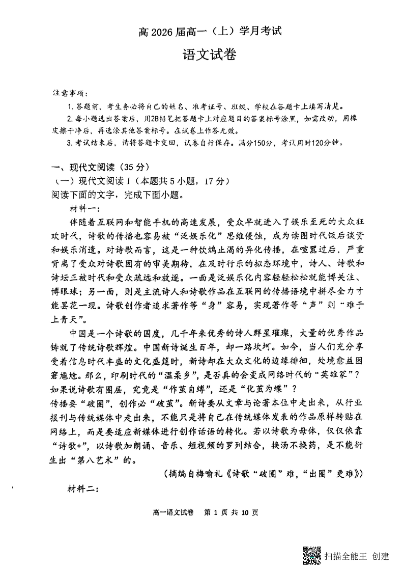 重庆市巴蜀中学校2023-2024学年高一上学期10月月考语文