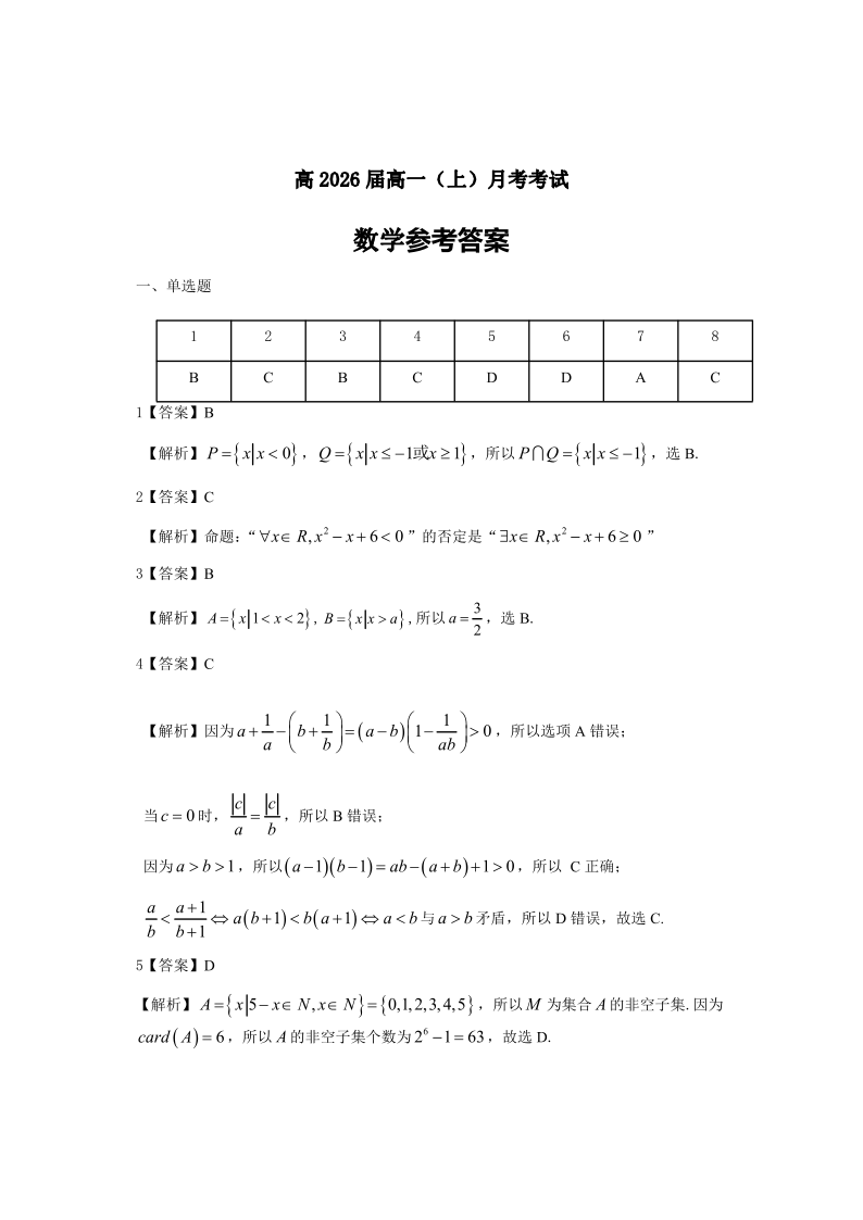 重庆市巴蜀中学校2023-2024学年高一上学期10月月考数学答案