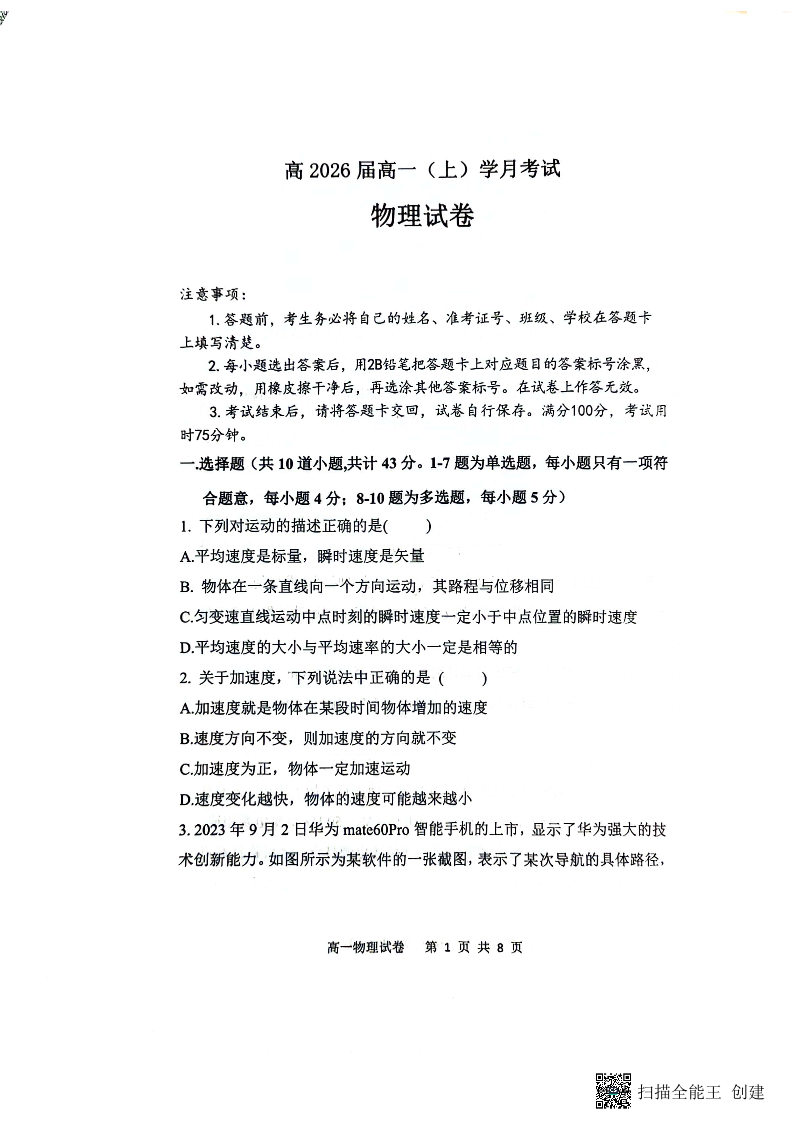 重庆市巴蜀中学校2023-2024学年高一上学期10月月考物理