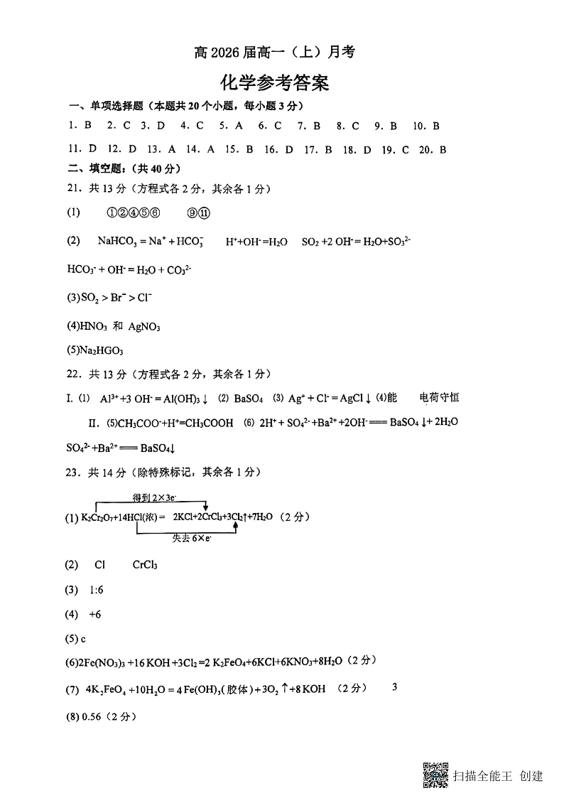 重庆市巴蜀中学校2023-2024学年高一上学期10月月考化学答案