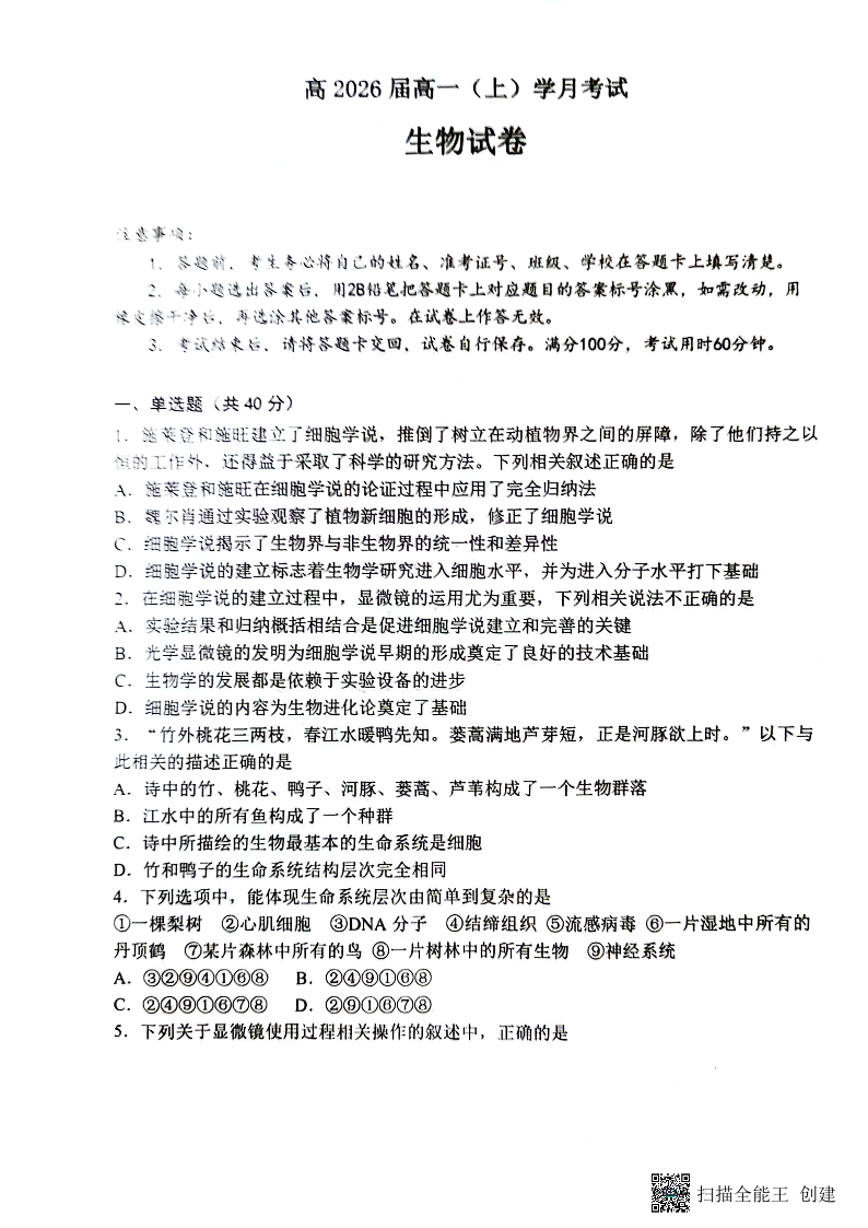 重庆市巴蜀中学校2023-2024学年高一上学期10月月考生物