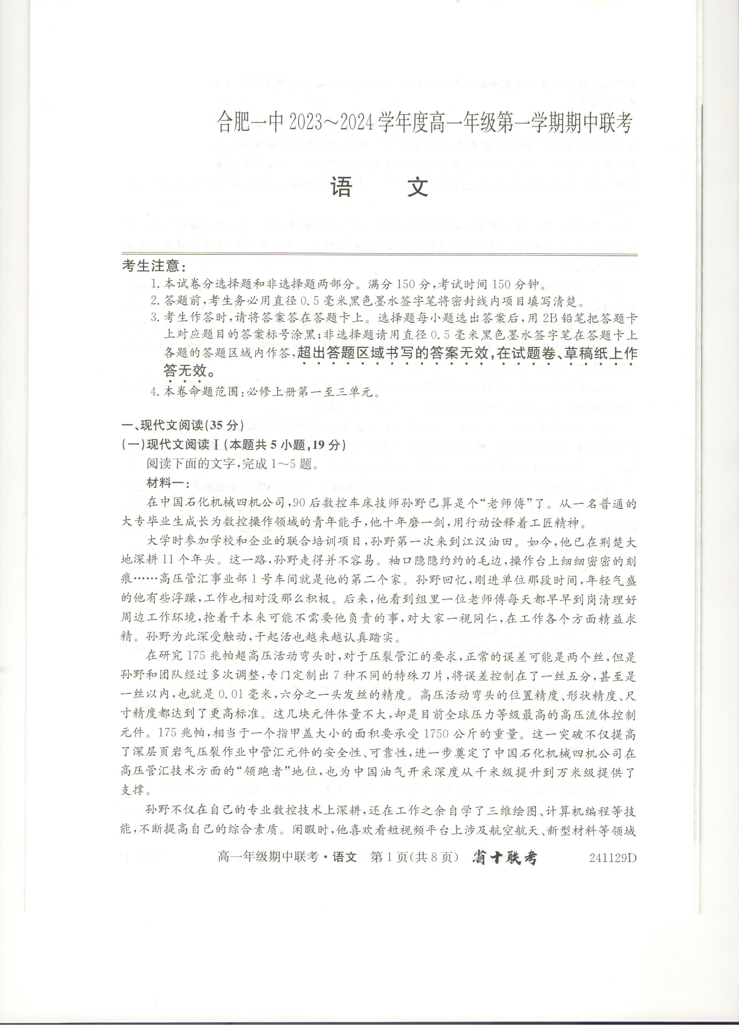 安徽省合肥市第一中学2023-2024学年高一上学期期中考试语文