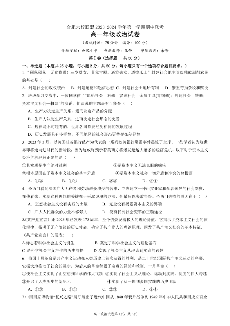 安徽省合肥市六校联盟2023-2024学年高一上学期11月期中考试政治