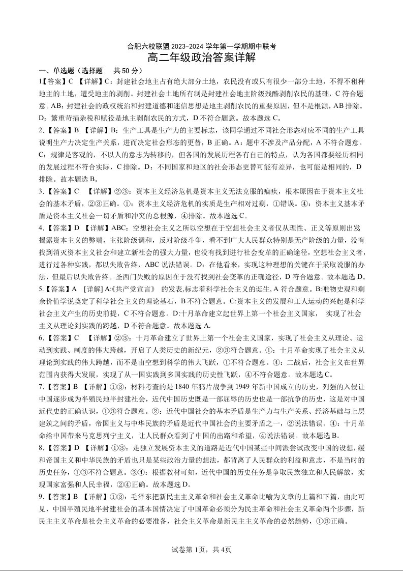 安徽省合肥市六校联盟2023-2024学年高一上学期11月期中考试政治答案