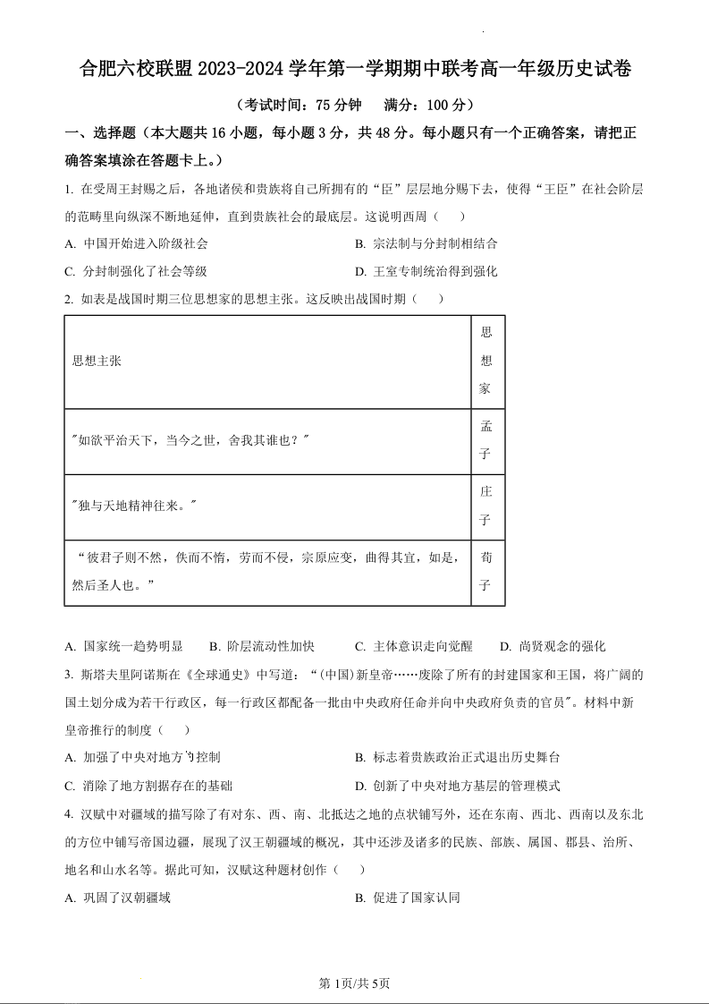 安徽省合肥市六校联盟2023-2024学年高一上学期11月期中考试历史(原卷版)
