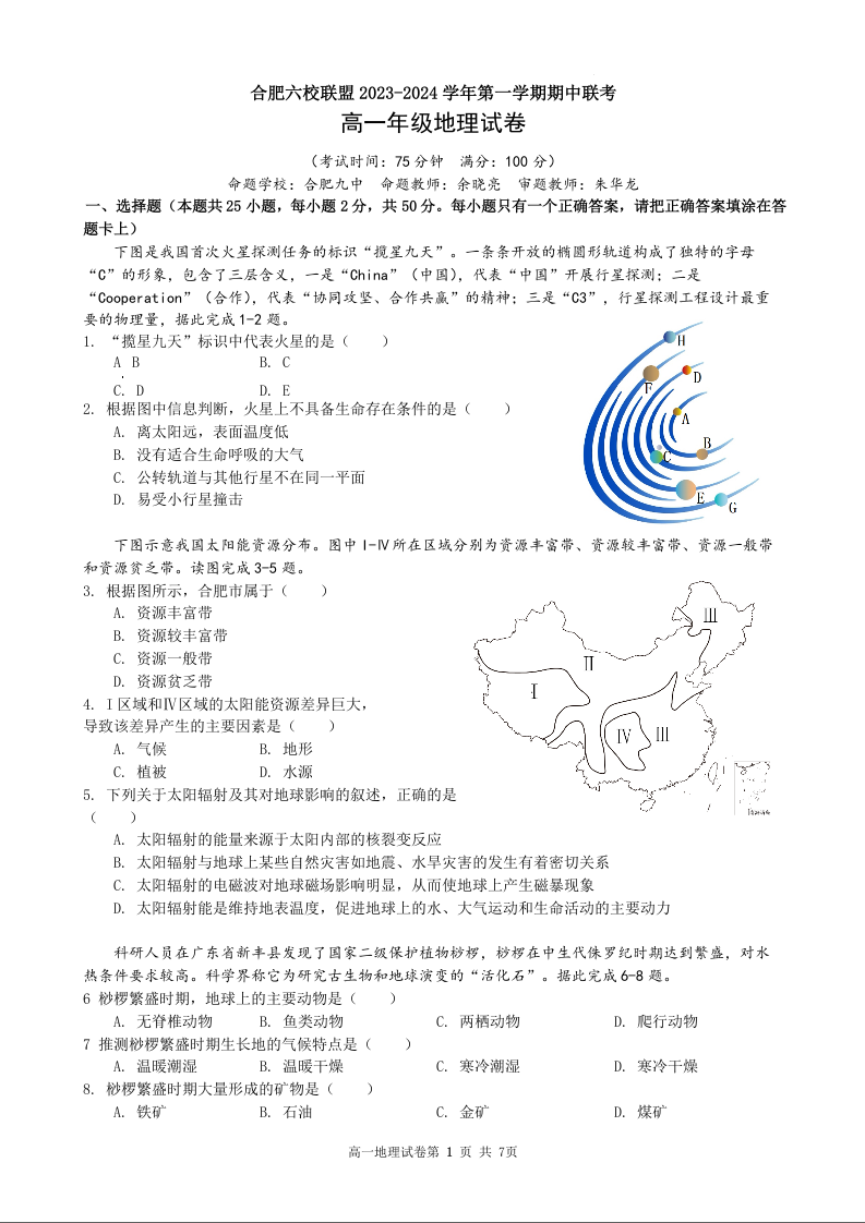 安徽省合肥市六校联盟2023-2024学年高一上学期11月期中考试地理