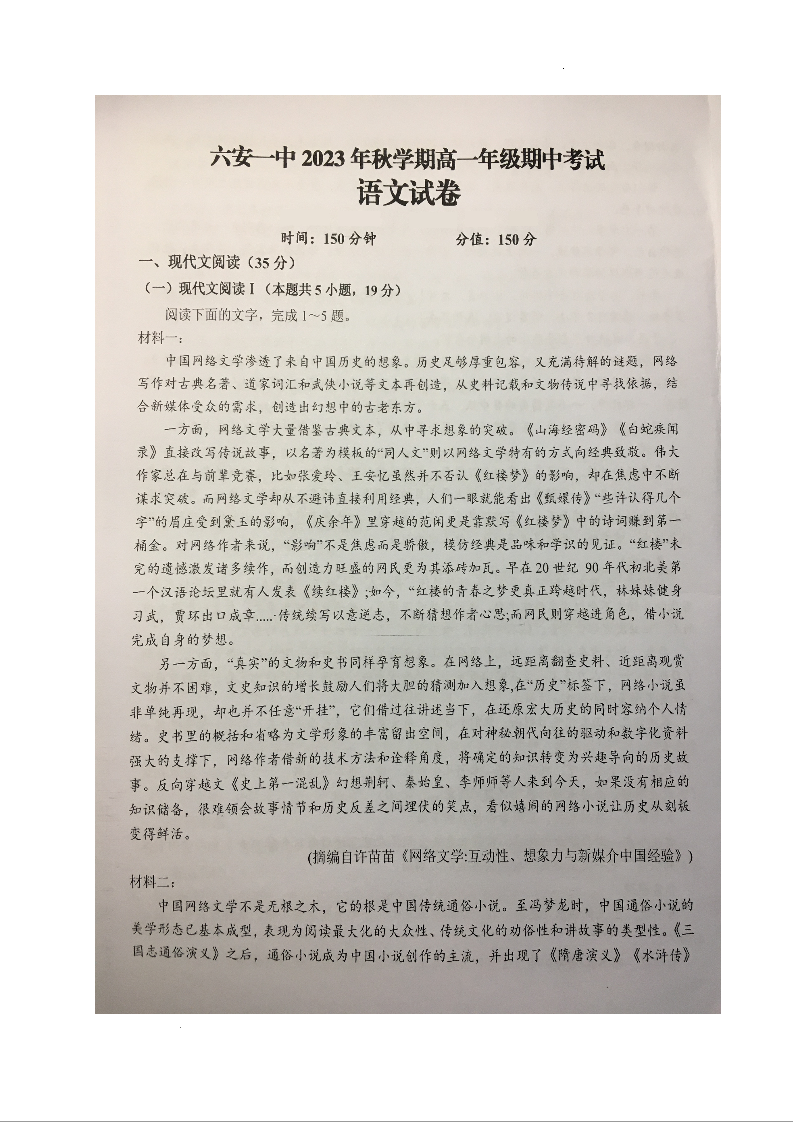安徽省六安第一中学2023-2024学年高一上学期期中考试语文+答案