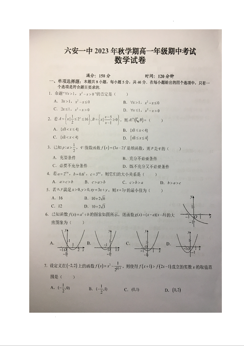 安徽省六安第一中学2023-2024学年高一上学期期中考试数学+答案