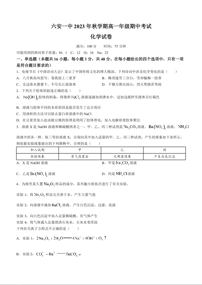 安徽省六安第一中学2023-2024学年高一上学期期中考试化学+答案