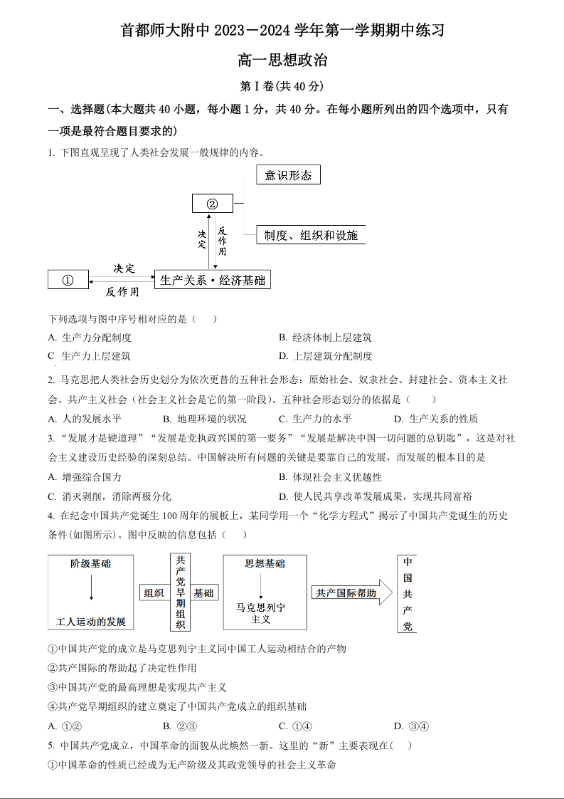 北京市首都师范大学附中2023-2024学年高一上学期期中考试政治+答案