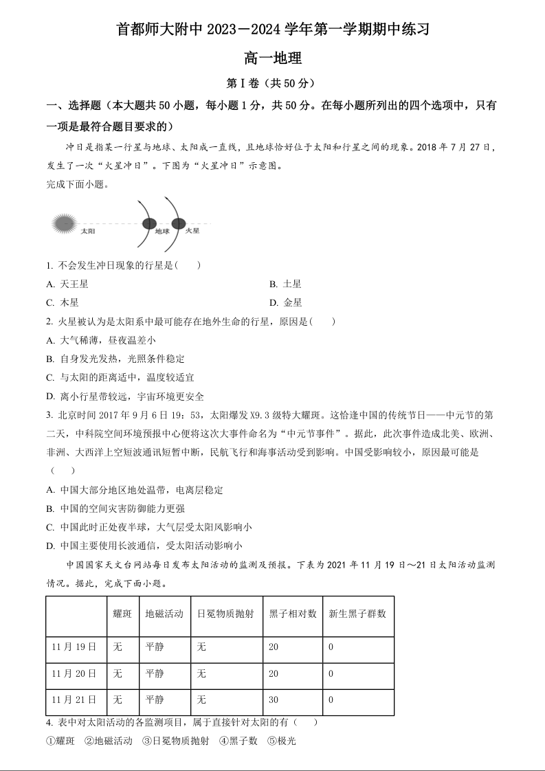 北京市首都师范大学附中2023-2024学年高一上学期期中考试地理+答案