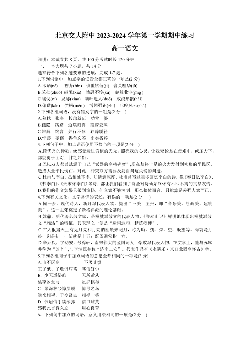 北京市交通大学附属中学2023-2024学年高一(上)期中考试语文+答案