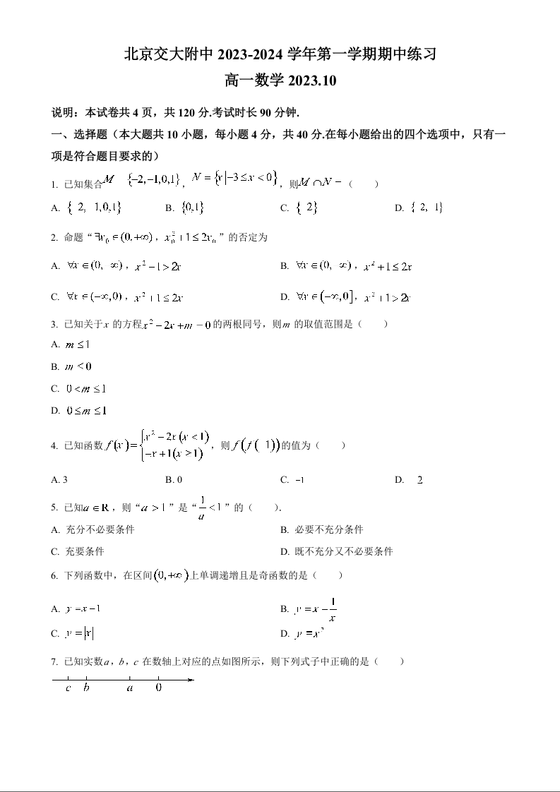 北京市交通大学附属中学2023-2024学年高一(上)期中考试数学+答案