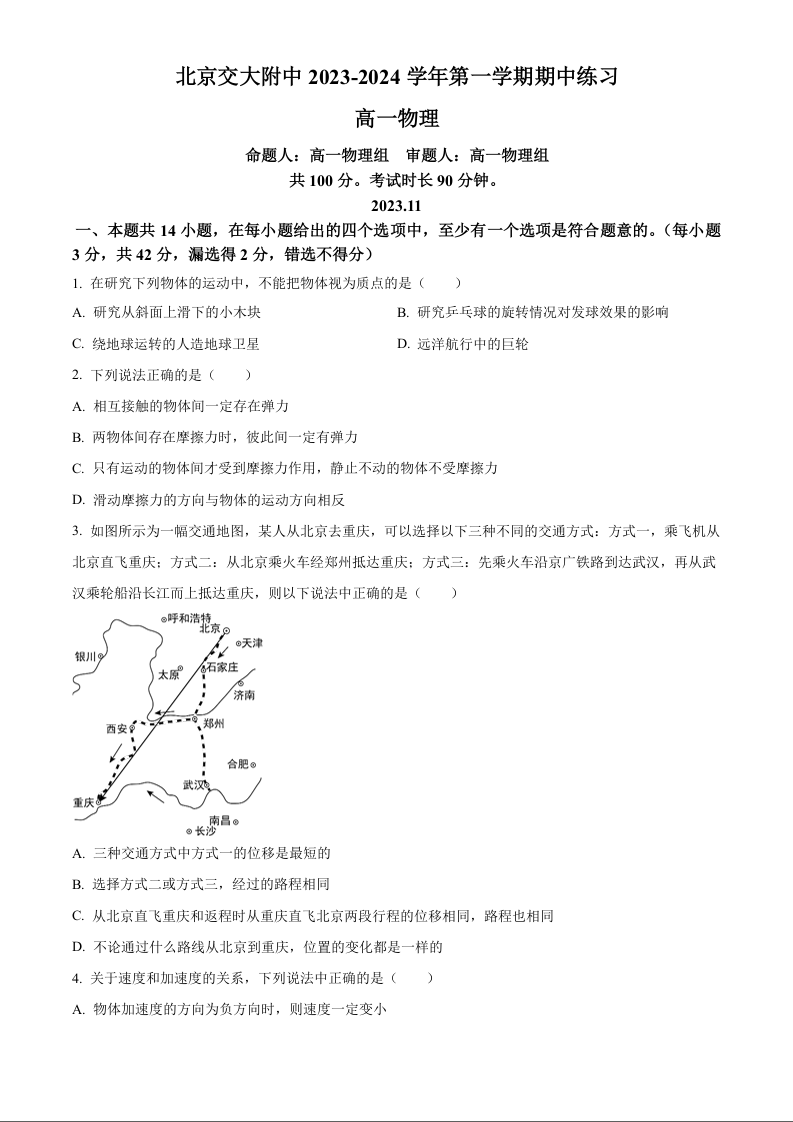 北京市交通大学附属中学2023-2024学年高一(上)期中考试物理+答案
