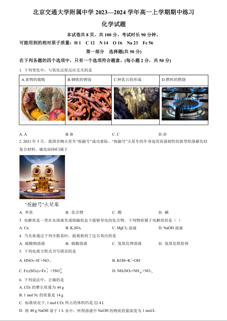 北京市交通大学附属中学2023-2024学年高一(上)期中考试化学+答案