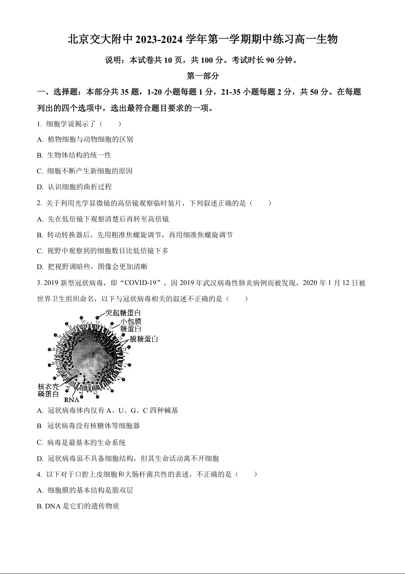 北京市交通大学附属中学2023-2024学年高一(上)期中考试生物+答案