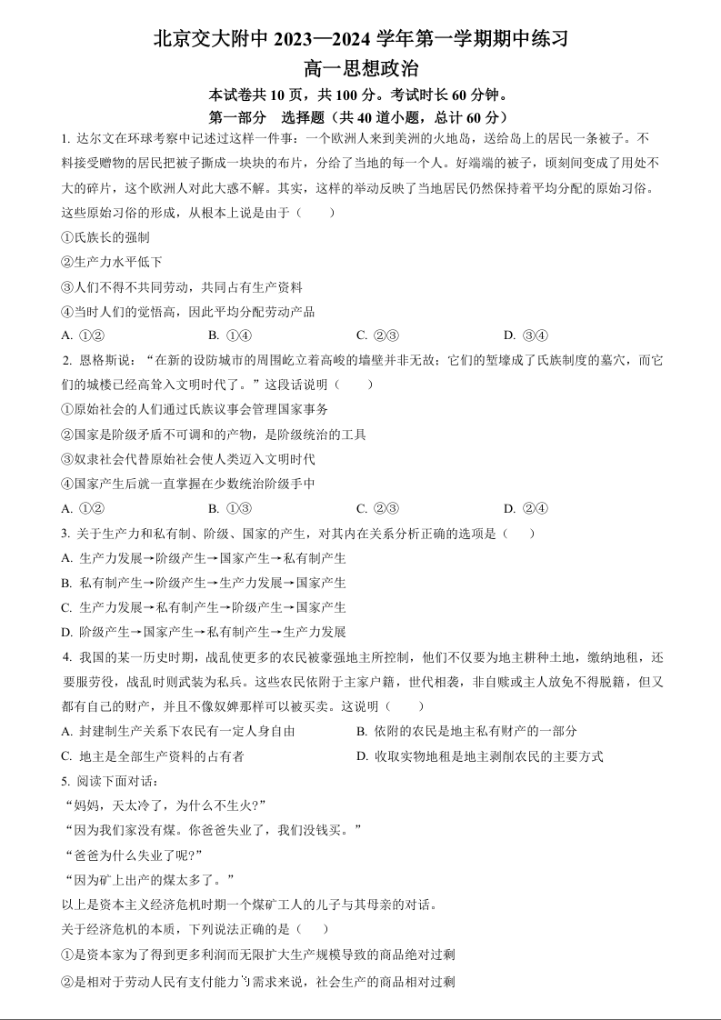 北京市交通大学附属中学2023-2024学年高一(上)期中考试政治+答案