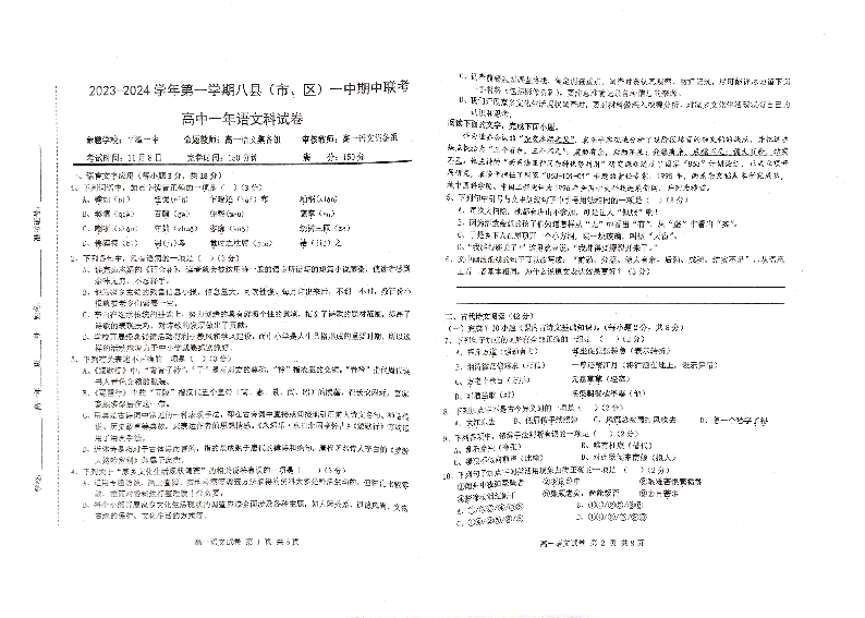 福建省福州市八县市一中2023-2024学年高一上学期11月期中联考语文+答案