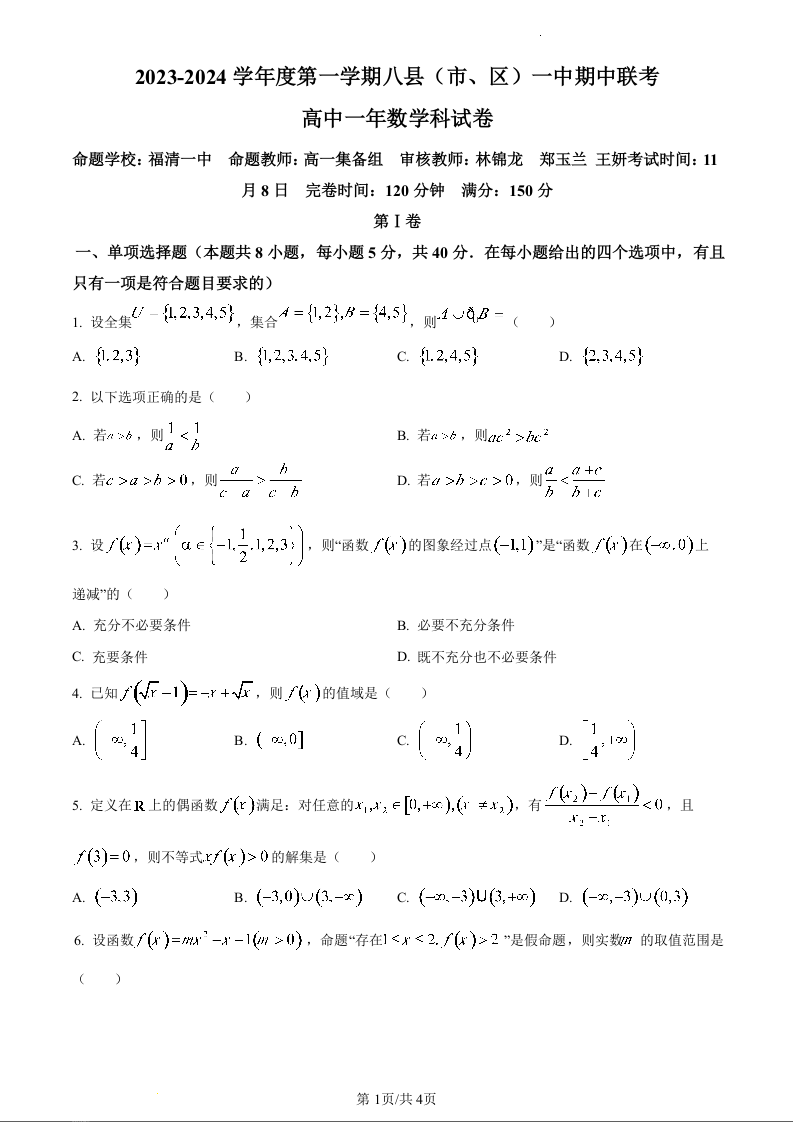 福建省福州市八县市一中2023-2024学年高一上学期11月期中联考数学(原卷版)
