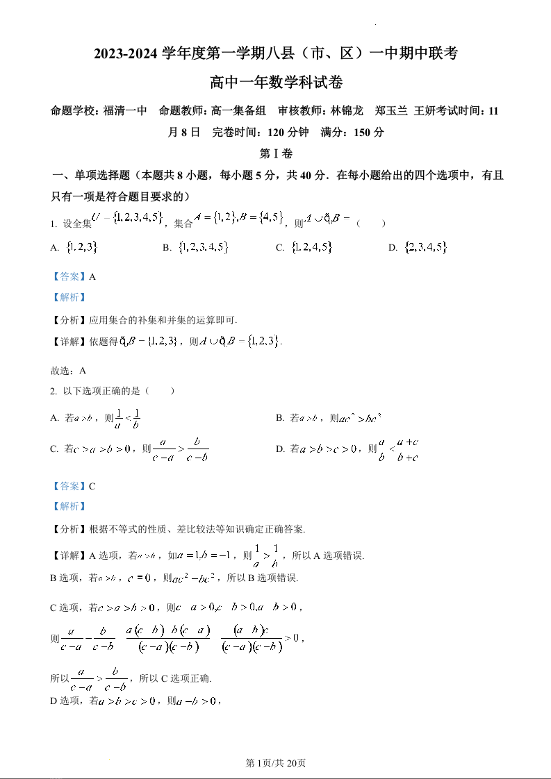 福建省福州市八县市一中2023-2024学年高一上学期11月期中联考数学(精品解析版)