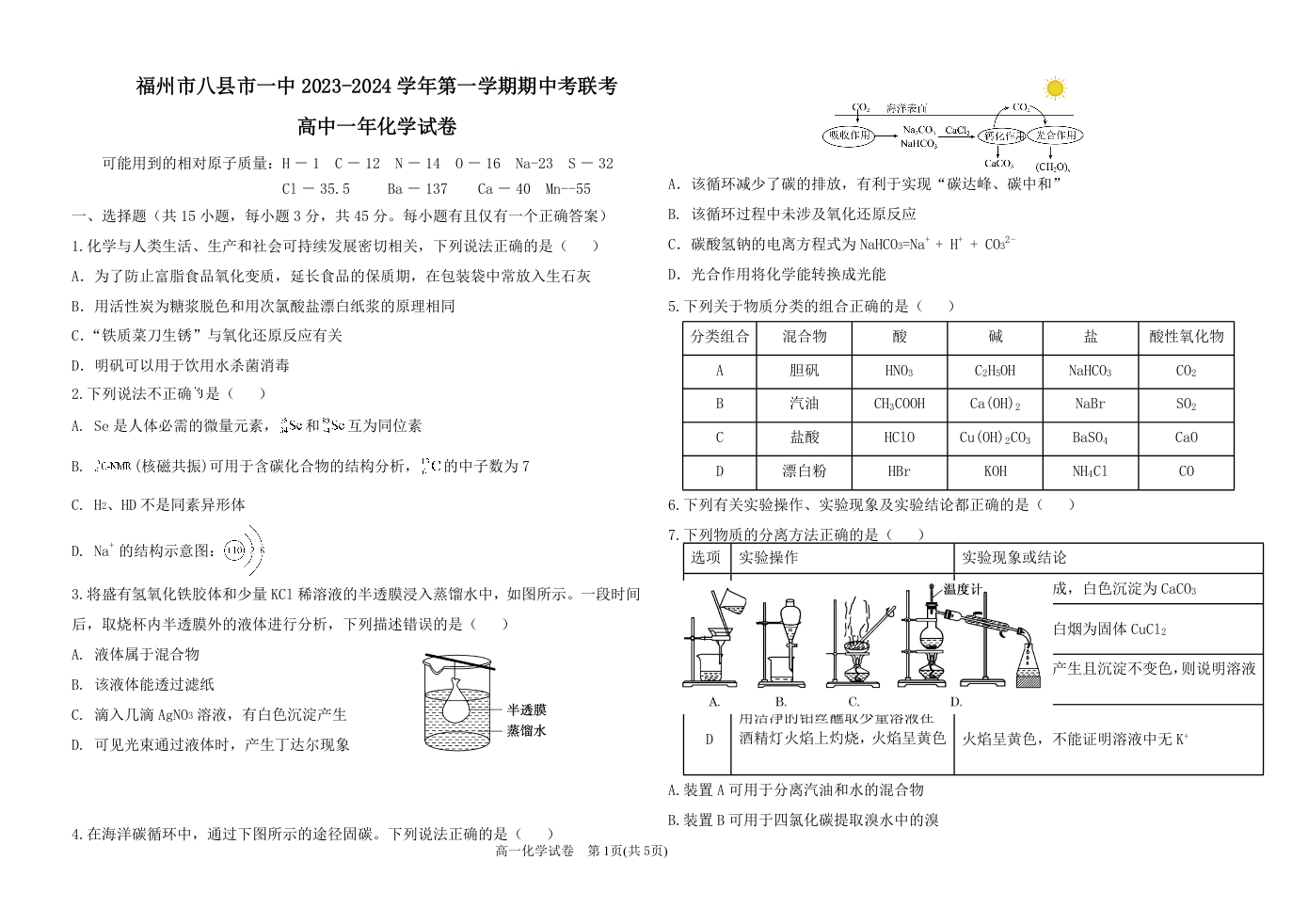 福建省福州市八县市一中2023-2024学年高一上学期11月期中联考化学+答案