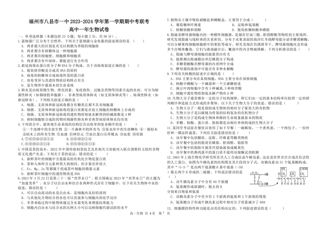 福建省福州市八县市一中2023-2024学年高一上学期11月期中联考生物+答案