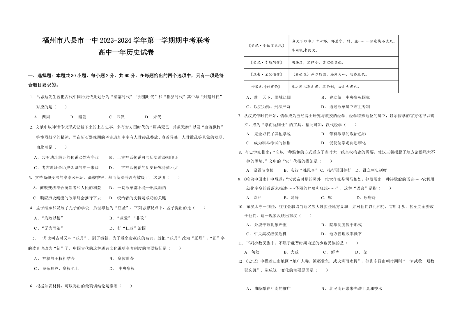 福建省福州市八县市一中2023-2024学年高一上学期11月期中联考历史+答案