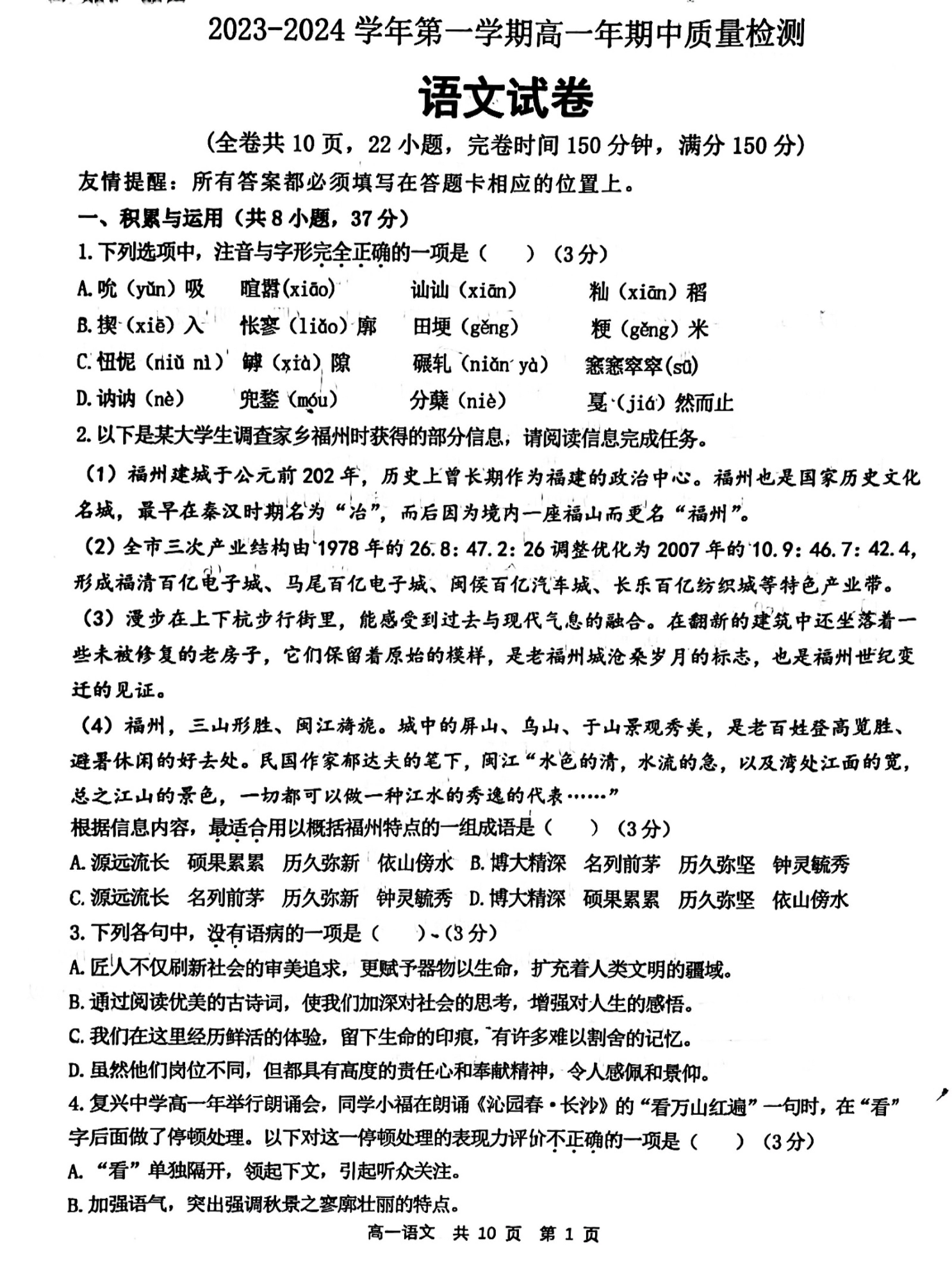 福建省福州市福清市2023-2024学年高一上学期期中质量检测语文