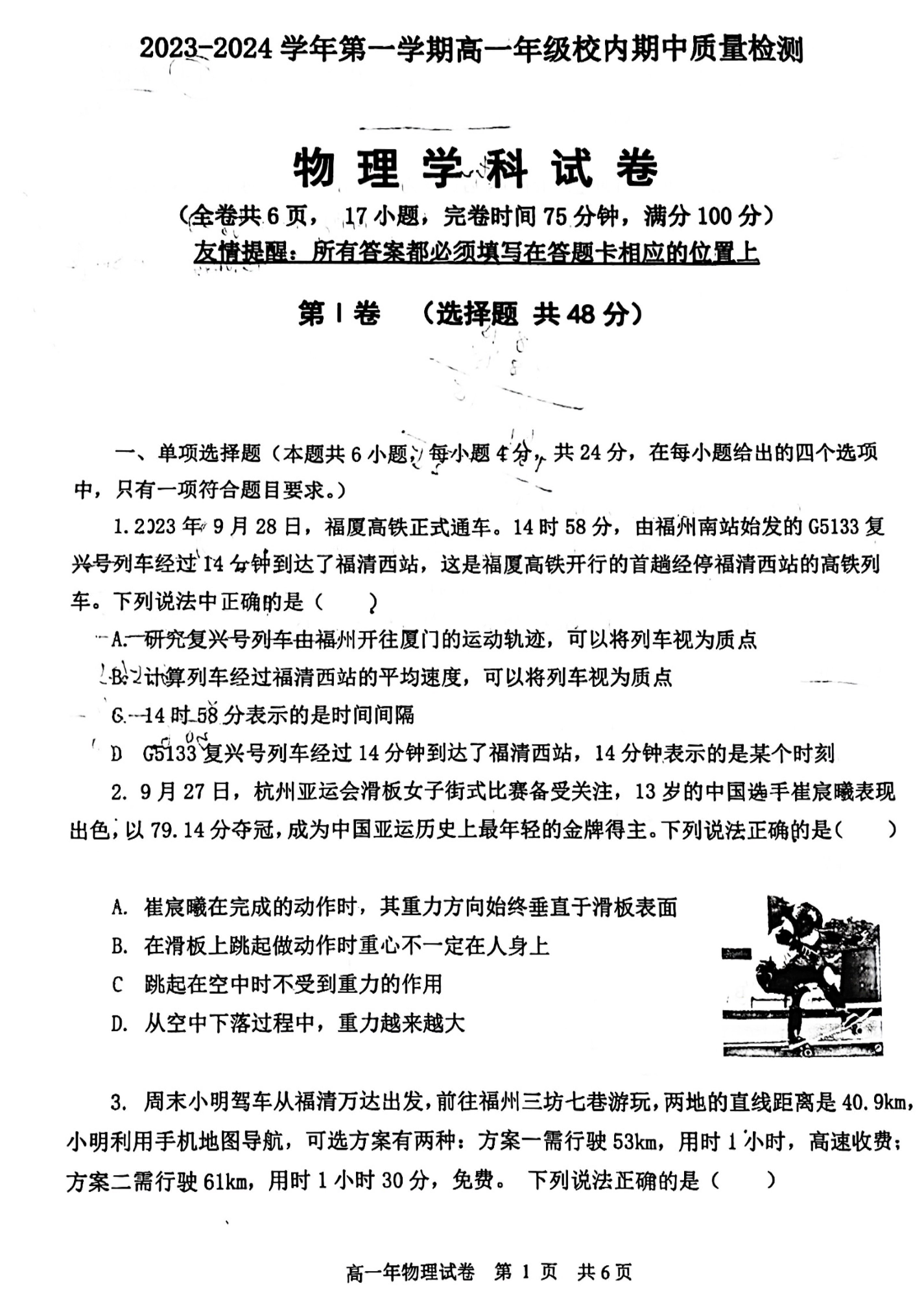 福建省福州市福清市2023-2024学年高一上学期期中质量检测物理
