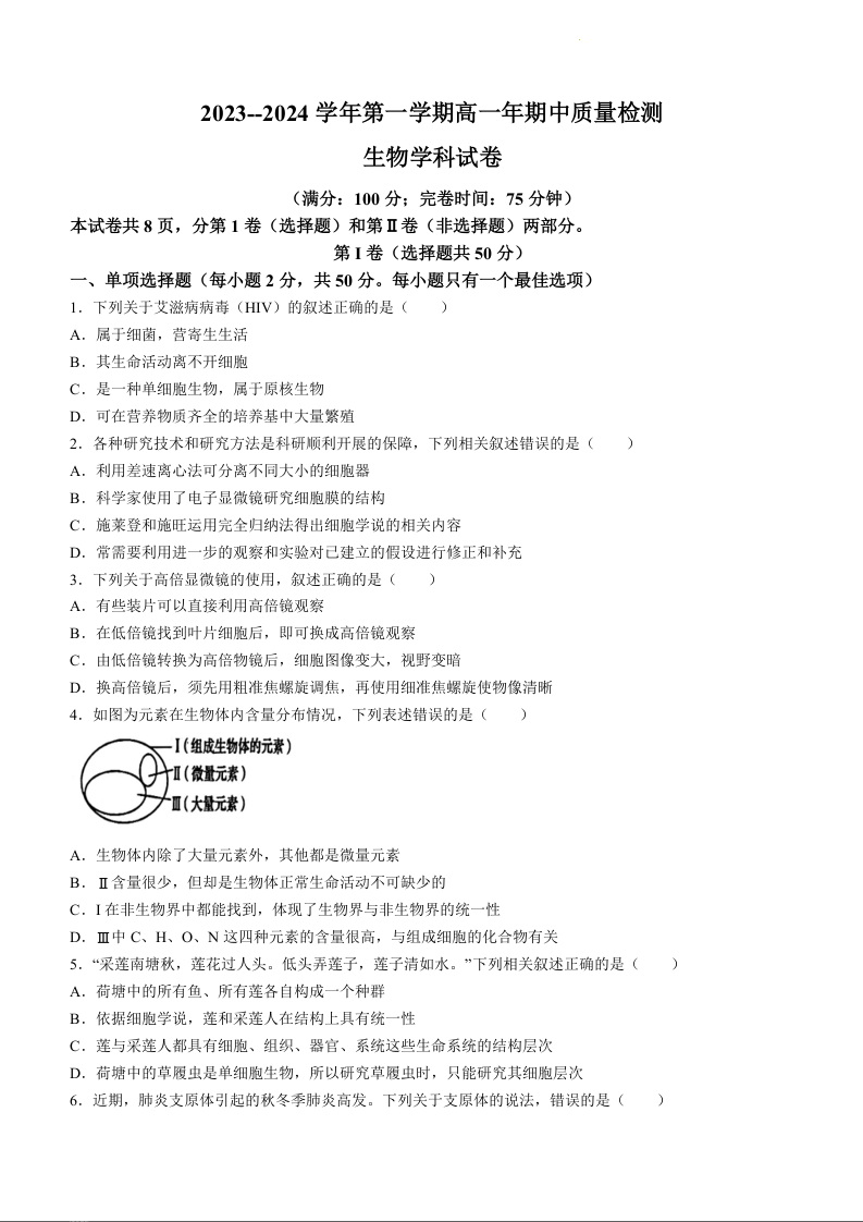 福建省福州市福清市2023-2024学年高一上学期期中质量检测生物