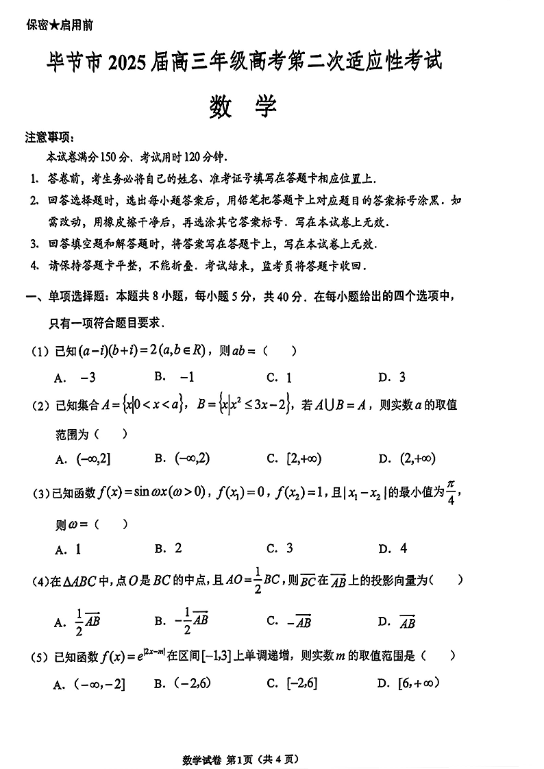 贵州省毕节市2024-2025学年下学期高三二诊测试数学+答案