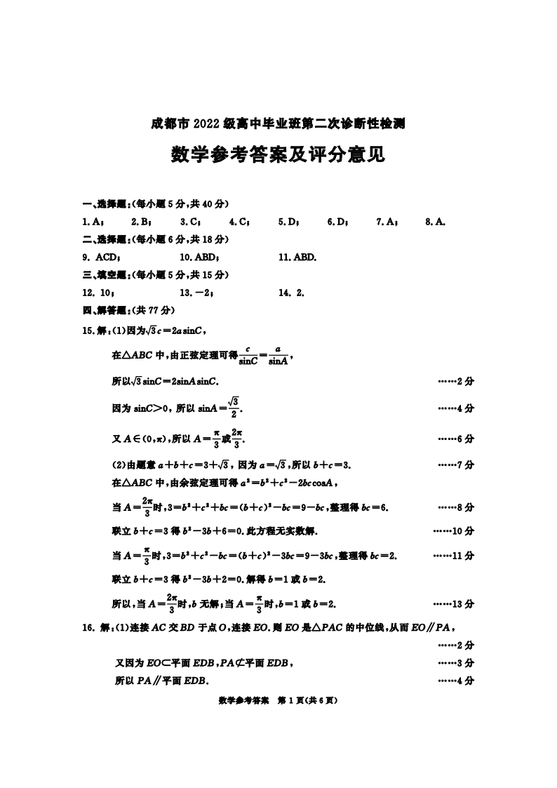 四川省成都市2024-2025学年下学期3月高三二诊统考数学答案