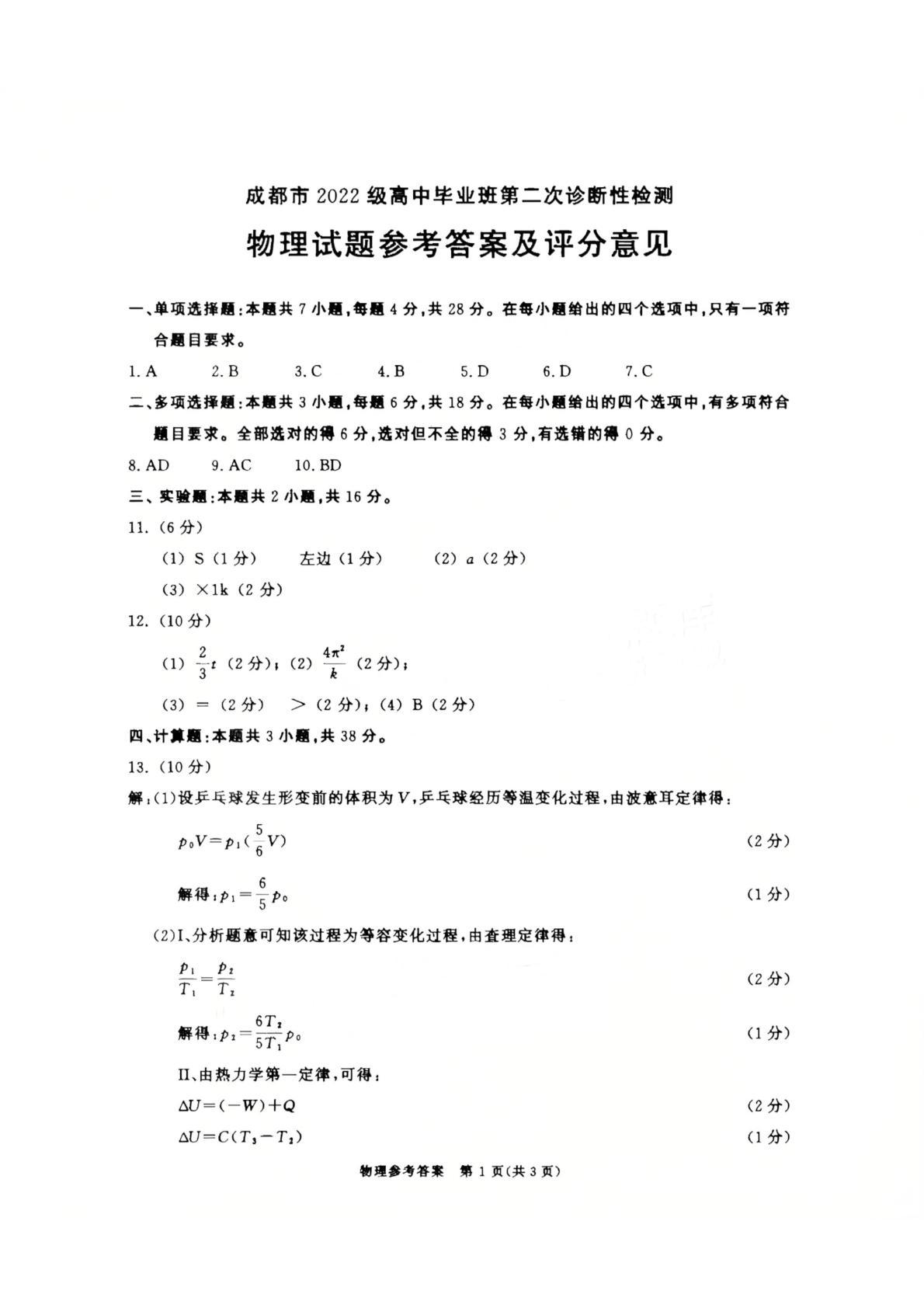 四川省成都市2024-2025学年下学期3月高三二诊统考物理答案