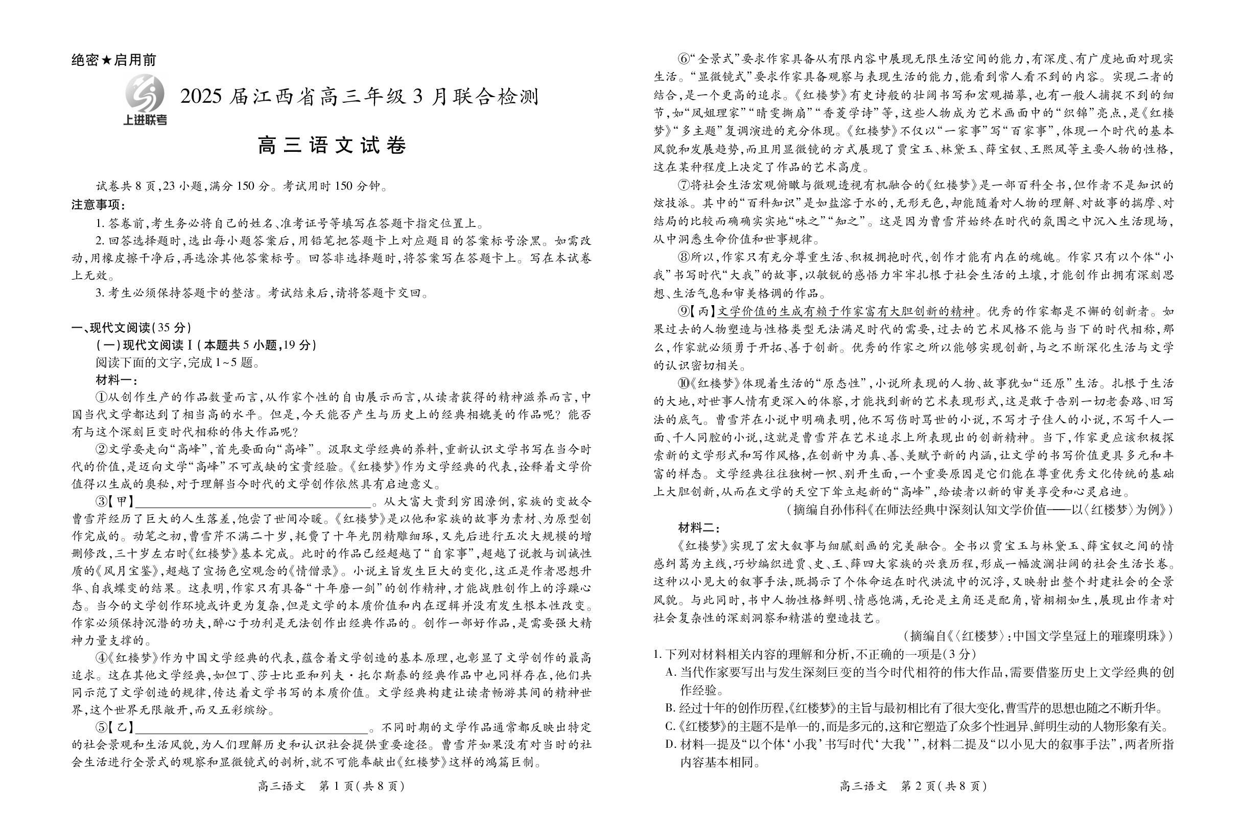 江西省上进联考2024-2025学年下学期3月高三二轮统一调研测试语文+答案