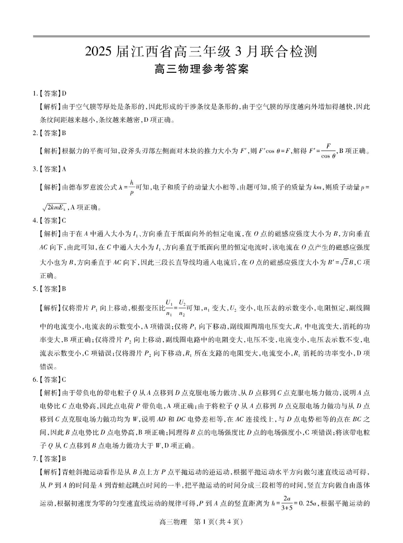 江西省上进联考2024-2025学年下学期3月高三二轮统一调研测试物理答案
