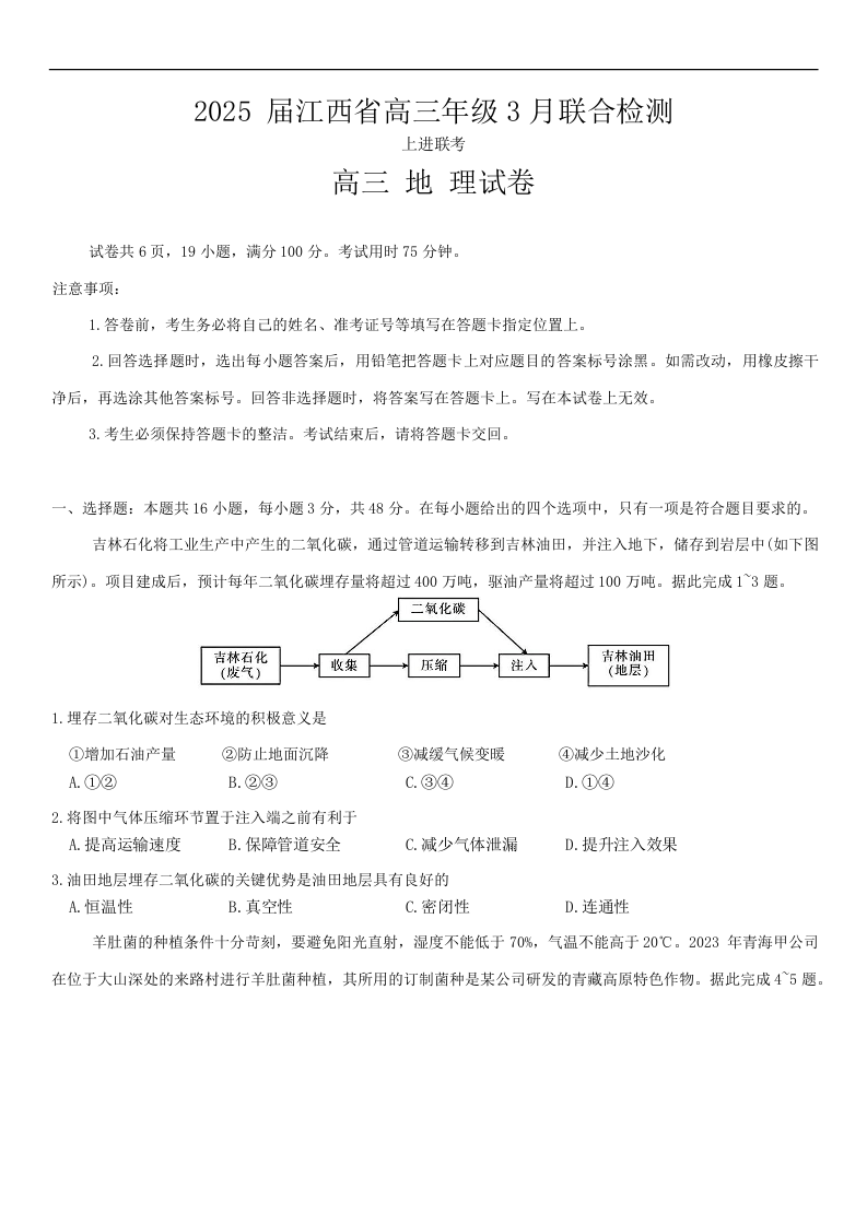 江西省上进联考2024-2025学年下学期3月高三二轮统一调研测试地理