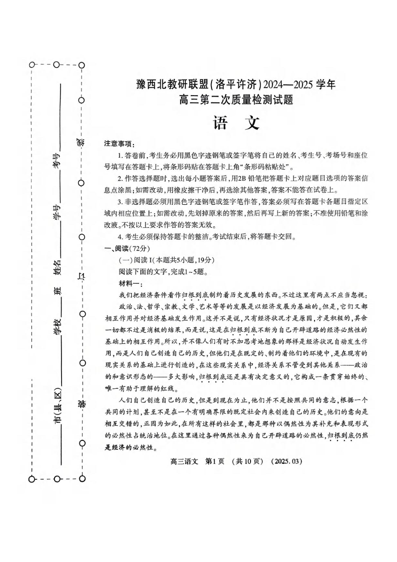 河南省洛平许济2024-2025学年下学期3月高三第二次质量检测语文+答案