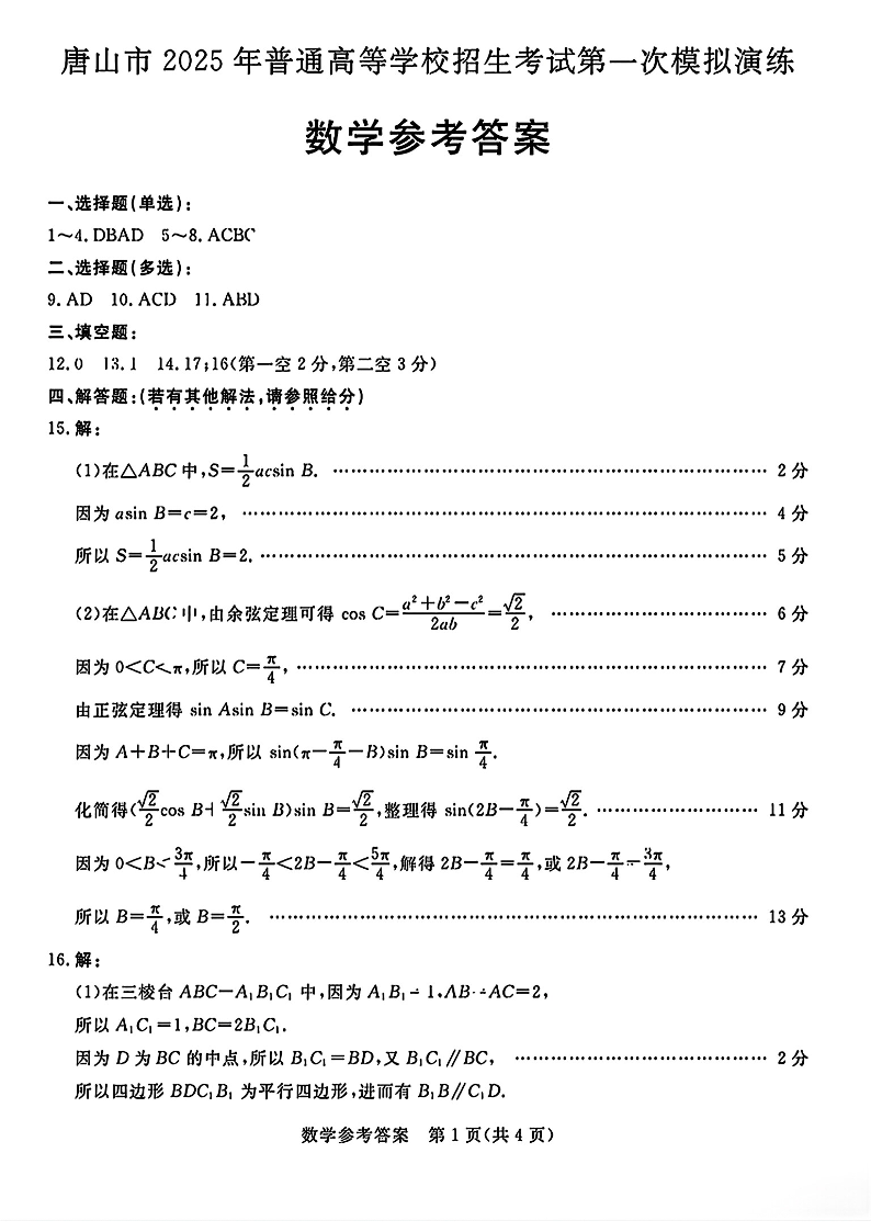 河北省唐山市2024-2025学年下学期3月高三一模统考数学答案