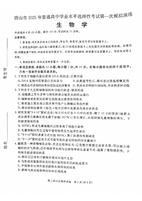 河北省唐山市2024-2025学年下学期3月高三一模统考生物