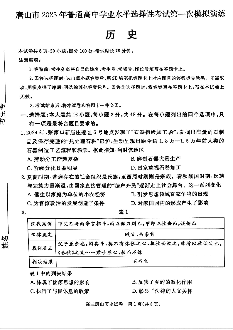 河北省唐山市2024-2025学年下学期3月高三一模统考历史