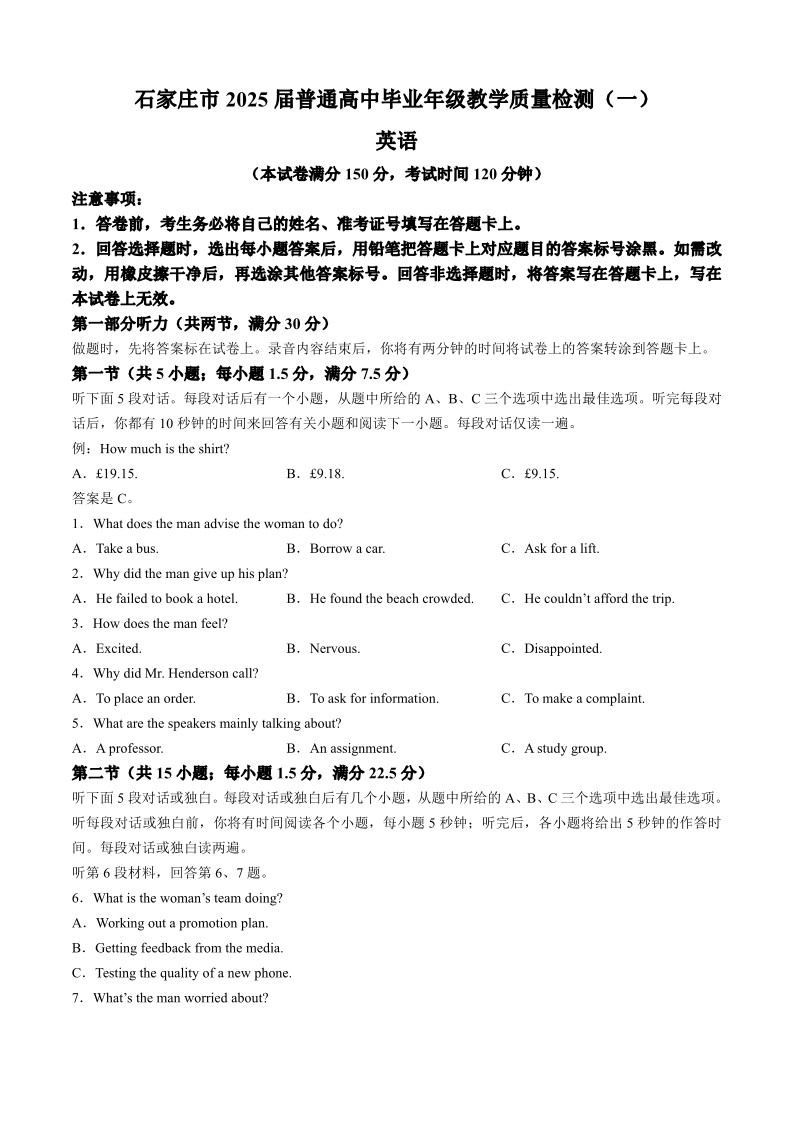 河北省石家庄市2024-2025学年下学期3月高三一模统考英语+答案