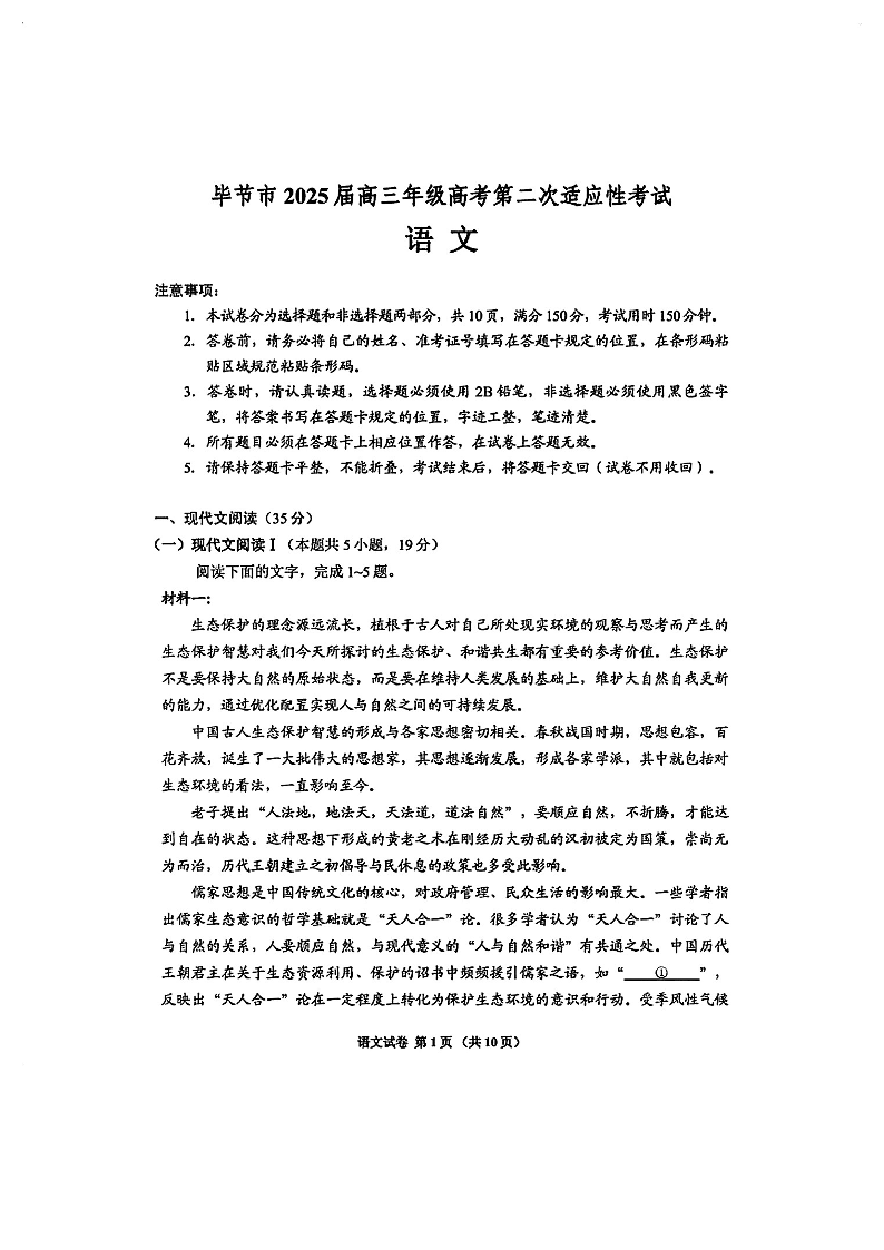 贵州省毕节市2024-2025学年下学期3月高三二诊统考语文+答案