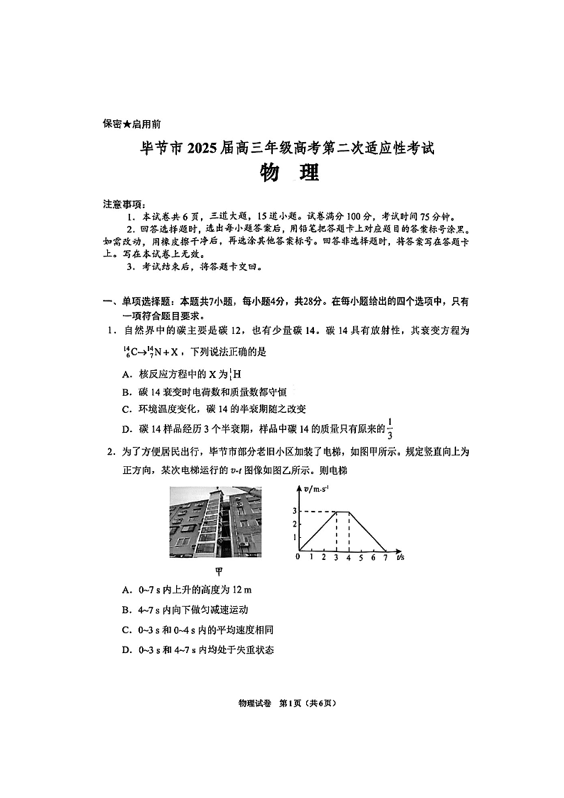 贵州省毕节市2024-2025学年下学期3月高三二诊统考物理+答案