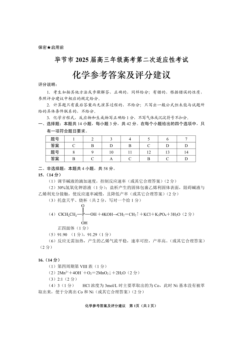 贵州省毕节市2024-2025学年下学期3月高三二诊统考化学答案