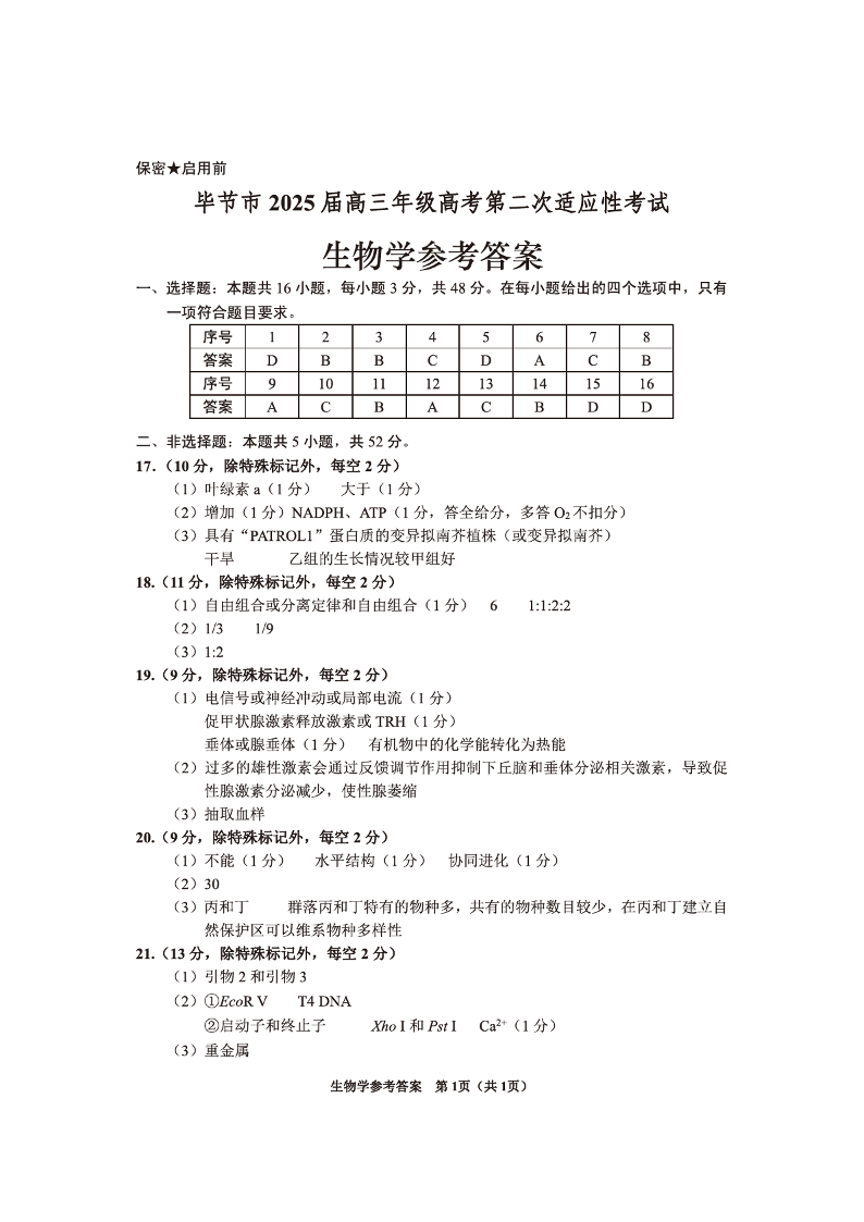 贵州省毕节市2024-2025学年下学期3月高三二诊统考生物答案