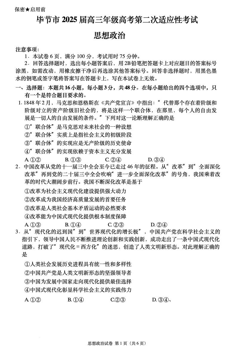贵州省毕节市2024-2025学年下学期3月高三二诊统考政治+答案